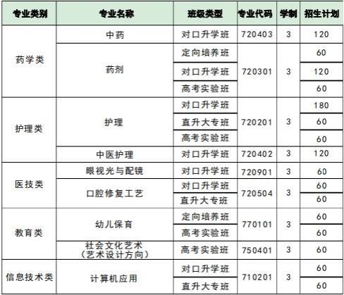 护理专业计划招收300名学生,药剂专业计划招收160名学生,中医护理专业计划招收120名学生,眼视光与配镜专业计划招收30名学生,口腔修复工艺专业计划招收120名学生,中药专业计划招收120名学生。此外,幼儿保育、社会文化艺术(艺术设计方向)、计算机应用等专业也各有相应的招生计划。
