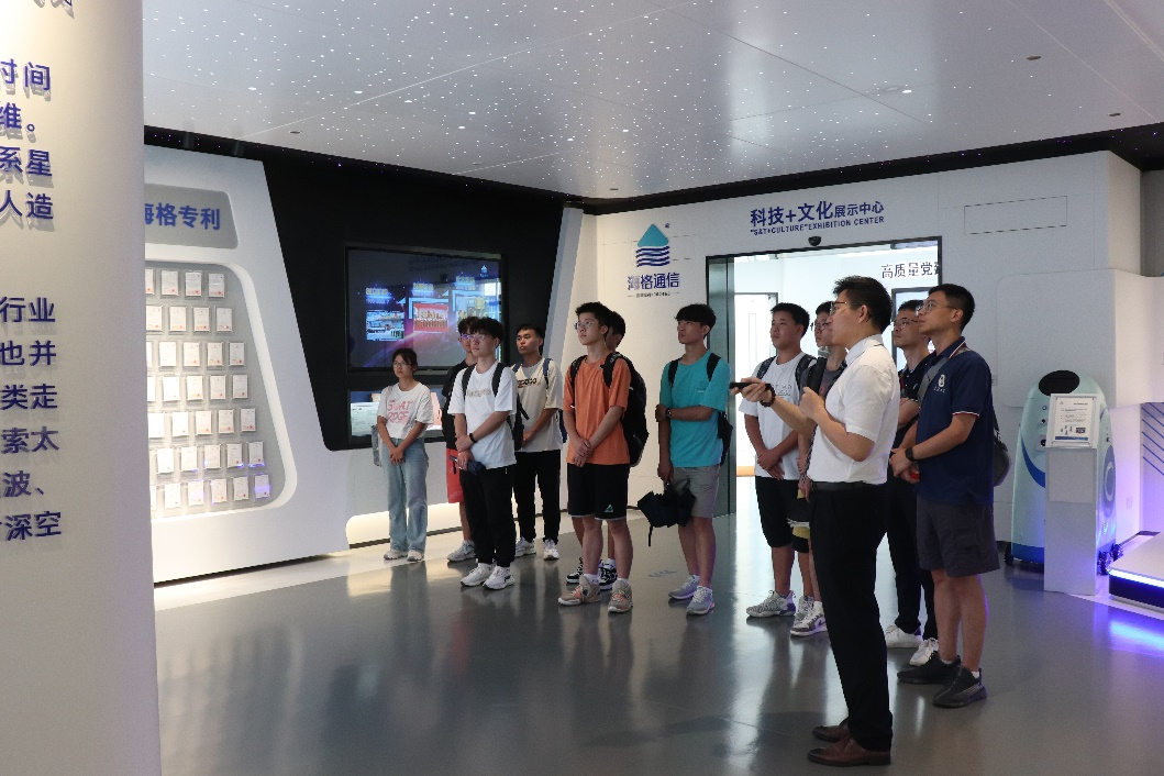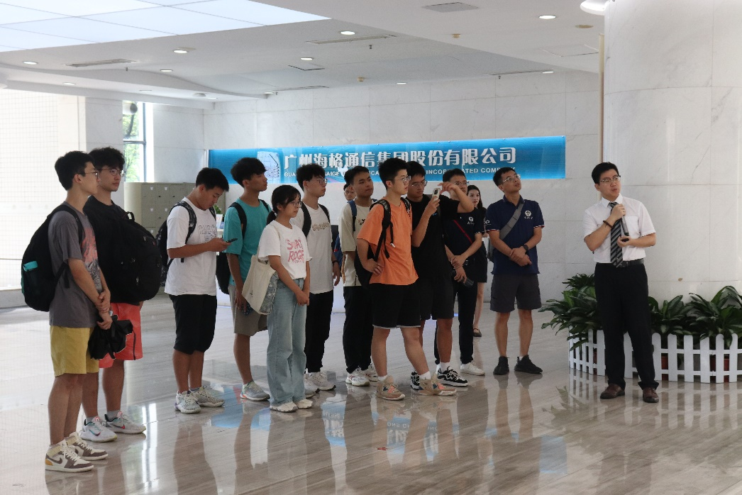 ) r* s& W+ T5 x7 V) y; k9 C1 h 8月18日下午,实践队抵达海格研发大楼一楼,人力资源部张仲明在大堂介绍了海格的企业文化,随后,带领实践队移步海格“科技+文化”展示中心参观。从海格通信及其母公司广州无线电集团的历史沿革、发展历程,到“无线通信、北斗导航、航空航天、数智生态”四大领域,对海格进行了全方位详细的介绍。