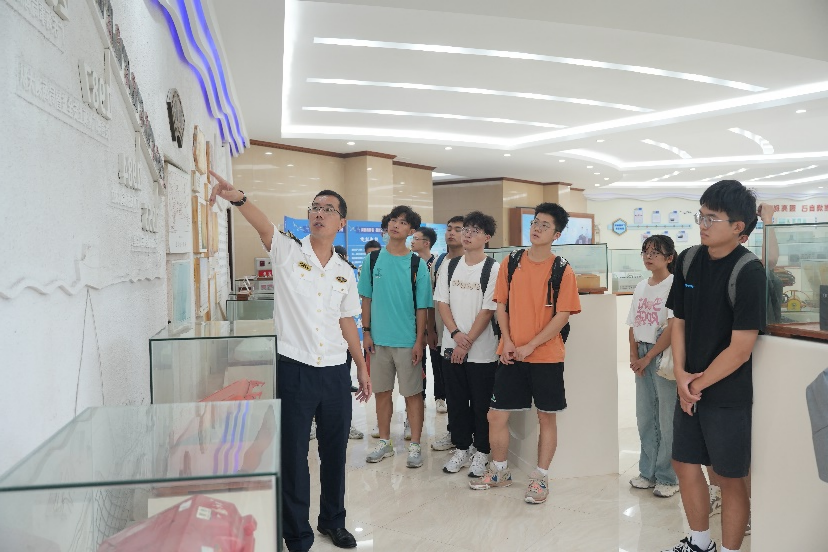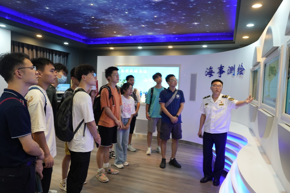在三楼创新成果展示室,技术装备科陈良科长向实践队介绍了广州海事测绘中心在测绘和导航方面的工作内容,包括建立南海海区北斗地基增强系统、实现广域分米级实时定位服务、实现区域厘米级实时精密定位服务、水上应急扫测,马航MH370失联航班搜索、广州港锦泽轮沉船应急扫测等内容。