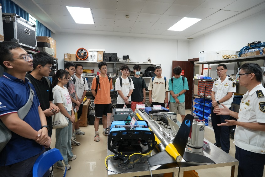 8 K: u) M( T+ t$ q 8月18日上午,实践队抵达广州海事测绘中心,在中心大楼一楼展厅,办公室主任王宇凯以世界海图发展史为引,向实践队介绍了广州海事测绘中心的发展历程,展示了中心仪器设备的变迁过程,介绍了目前海测中心的设备仪器,包括侧扫声纳、无人机、三维激光扫描仪等。  ) O K; s: E, C7 \ x
