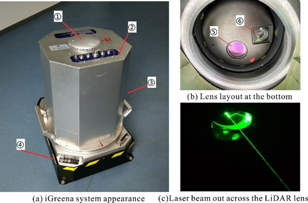 1 b% ? }: j& A0 O) ~. Y% [ 图5. 机载测深激光雷达系统. ①风冷散热系统; ②接口面板; ③激光雷达外壳; ④惯性稳定平台; ⑤激光雷达镜头; ⑥航空相机镜头. - {% j! O6 c! P' k/ P