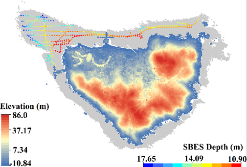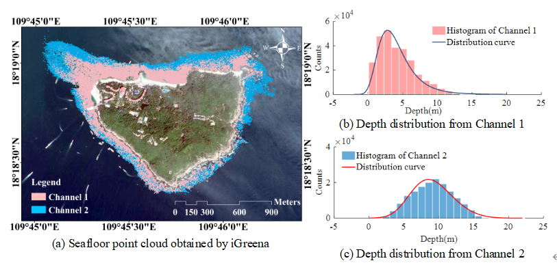 * u& ^0 V3 q! {, S2 b" O 深圳大学机载测深激光雷达研究团队通过广泛深入地理论论证、整体设计以及实验验证,于2019年底研制完成了具有自主知识产权的实用化机载单波段测深激光雷达系统iGreena,该装备实现了我国在机载单波段测深激光雷达研制领域的技术突破。系统采用超高频小波束角蓝绿激光探测技术,使激光雷达回波信号采样率提高至1.25GHz,并将探测激光发散角缩小至0.428mrad。相比国内外同类设备,该系统设计有效减小了回波信号中的目标辨识误差,简化了点云解算及其误差模型,提高了波形处理与分析过程中水陆目标的探测精度。
