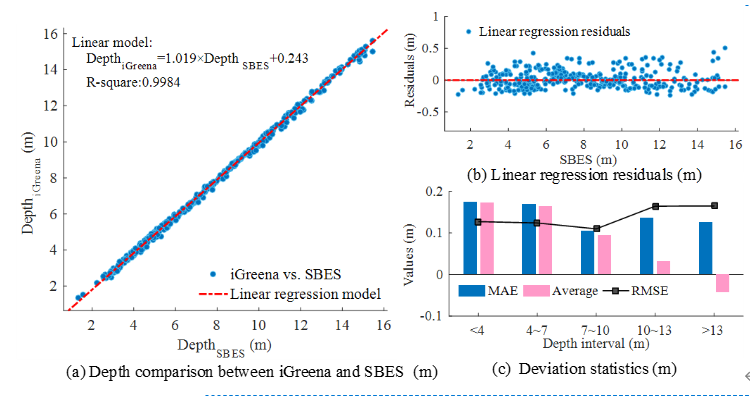 图 12. iGreena 水深探测与单波束测深结果对比 w: c' q2 X- N- H8 r3 k