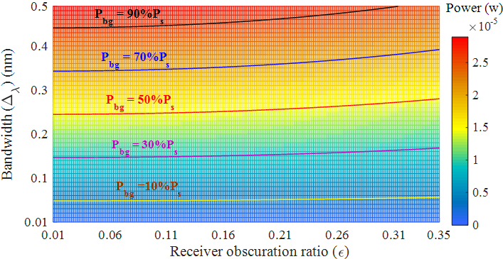 P+ b; m7 |6 f) M2 O5 a 图 3. 接收器遮光率与窄通滤波对环境背景光功率的限制效果( 光回波辐射,回波中的环境光辐射) 7 J& y" y% z' C