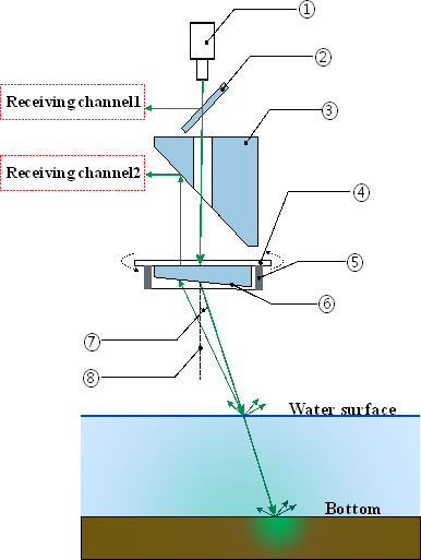 图 1. 机载测深激光雷达原理与光机结构设计(①激光发射器; ②分光片; ③光学角反射镜; ④扫描角度编码器; ⑤扫描电机; ⑥楔形旋转棱镜;⑦发射激光天底角;⑧扫描旋转轴线)