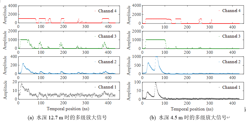 , q" B7 E, _8 m8 x; l+ u- f 图 4. 不同水深条件下信号多级放大效果 w' B! s2 M2 A, L* Z- Y: v
