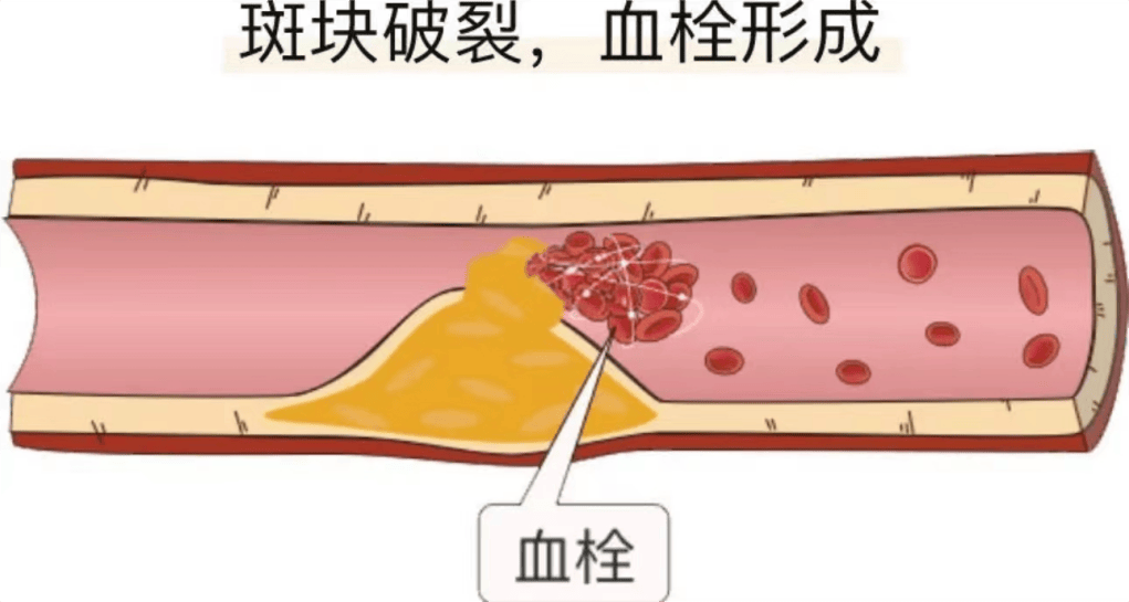需要注意的是,斑块是经过长时间演变,已经“长”在血管内壁上。斑块一旦破裂,就会触发凝血机制,血小板、凝血因子等纷纷赶来,聚集到裂口处,形成一个大血块,这便是血栓。而血栓是未必会固定在一处,随时可能脱落随血液一起流淌。血栓游走时,一旦在某处血管中造成堵塞,就会引起一些急症,比如心梗、脑梗,导致相关脏器因缺血而坏死。