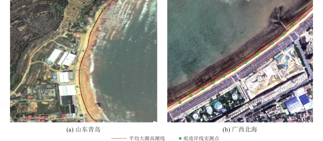 图3为砂质岸线的位置比较,图3a研究区位于山东,图3b研究区位于广西。砂质岸线一般比较平直,海滩上部常常堆成一条与岸平行的脊状砂质沉积,称滩脊。痕迹海岸线一般界定在滩脊顶部向海一侧,滩脊顶部没有明确的痕迹线,不同的人判定的位置不一样,属于比较难确定的岸线。由图3可知,砂质岸线的痕迹岸线高于平均大潮高潮线,而且不同位置的平面位置差距也不同,二者位置最大相差14m。在小范围内平均大潮高潮线的高程是相等的,而实测的痕迹点高程不尽相同,主要是由人工识别的主观性导致。