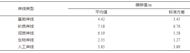 目前,海岸线的测定方法主要采用以上两种方法,但两种方法测定的岸线位置会有所不同。从理论上看,基于潮汐模型的海岸线测定方法是客观的,测定的岸线位置是确定的;实地测量的痕迹岸线位置随着海岸线类型、岸线走向、地貌特征以及判定依据的不同存在差异,利用卫星遥感方法获得痕迹岸线也受局部地形、气象引起的水位变化以及判定依据不同的影响,位置存在较大的不确定性,所以二者测定的海岸线位置的差异不确定,会因海岸线类型、岸滩地形等呈现不同的位置差异。按照上节的技术方法利用研究区(山东和广西部分区域)数据建立沿海潮汐模型,结合1∶10000比例尺DEM提取了研究区的平均大潮高潮线。于2019年和2020年分别在山东和广西两地按照不同岸线类型测量了210段典型岸段的痕迹岸线,将其和平均大潮高潮线进行了位置比对,比对偏移结果见表2。