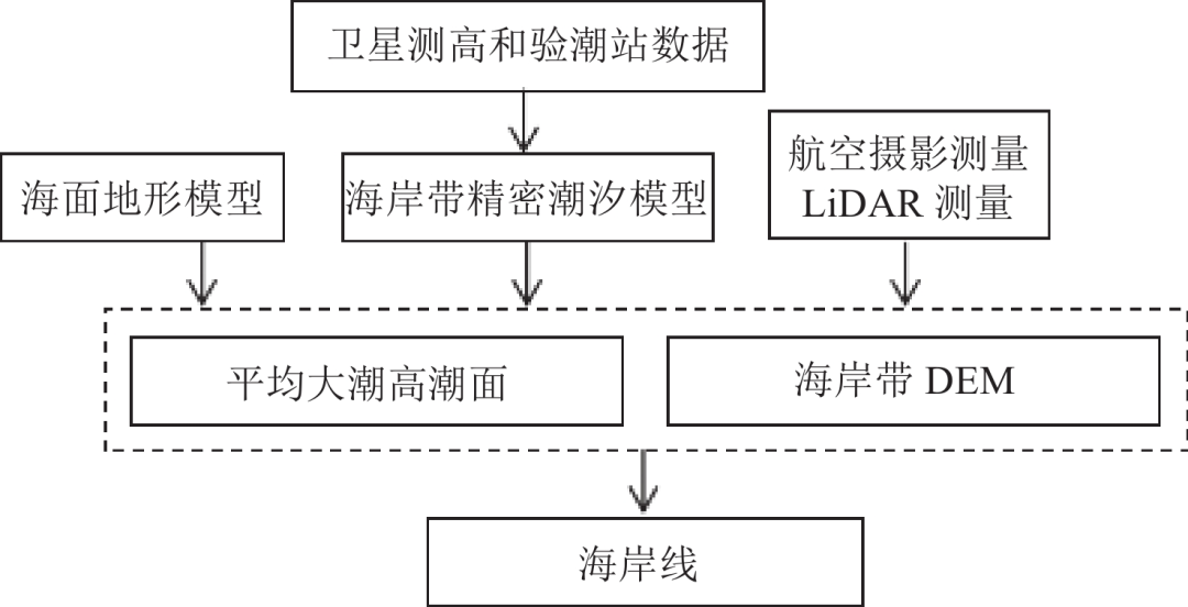 从海岸线定义来看,确定海岸线就是确定多年平均大潮高潮面的位置。基于潮汐模型和DEM的海岸线测定技术采用构建的潮汐模型确定平均大潮高潮面的准确位置,从而确定海岸线的唯一位置。采用此方法提取海岸线,首先采用卫星测高和验潮站数据建立海岸带区域精密潮汐模型,计算平均大潮高潮面,并结合海面地形模型确定平均大潮高潮面和1985国家高程基准的关系;然后建立该区域基于1985国家高程基准的数字高程模型(DEM);最后从DEM中提取MHWS的高程值的点位并连接成连续的线就是海岸线。简言之,就是联合潮汐模型和DEM的方法确定海岸线,具体流程见图1。平均大潮高潮线的位置提取精度和潮汐模型、DEM的精度有关,因此,要测定高精度海岸线位置,需得到高精度的平均大潮高潮面的高程值和海岸带区域的DEM,这涉及沿海精密潮汐模型、垂直基准转换模型和DEM的构建技术。