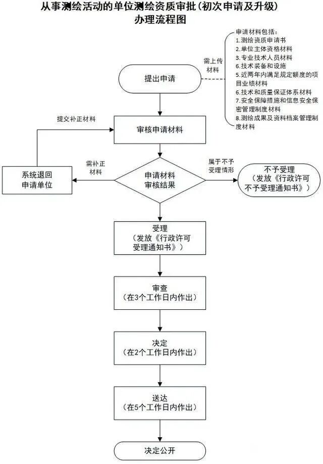 一般来说测绘资质审批的流程大同小异,梳理了一下流程大概如下: & H8 u7 e) A* Z1 Q* @' H