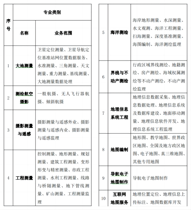 ②测绘专业是指大地测量、工程测量、摄影测量、遥感、地图制图、地理信息、地籍测绘、测绘工程、矿山测量、海洋测绘、导航工程、土地管理、地理国情监测等专业。测绘相关专业是指地理、地质、工程勘察、资源勘查、土木、建筑、规划、市政、水利、电力、道桥、工民建、海洋、计算机、软件、电子、信息、通信、物联网、统计、生态、印刷、人工智能、大数据、云计算、保密、档案等专业。 * ^% D, K! k% o: V0 s, n4 T" s7 d
