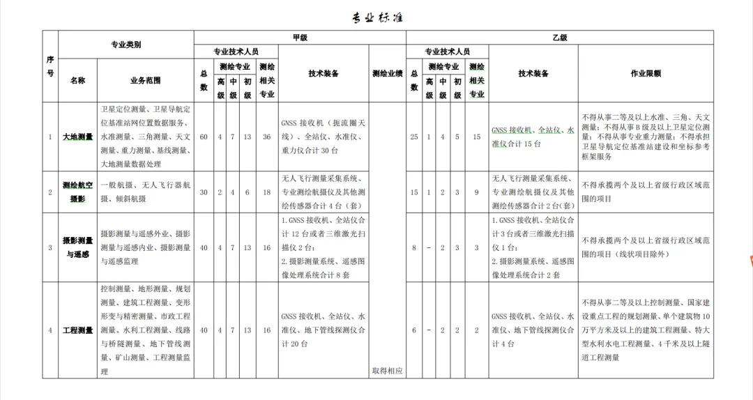 5 h4 G0 n/ ?+ v9 T @5 N 1.测绘资质分为10个专业,每个专业所承揽的工程范围都不一样,一定要选择适合自己的专业。太多的话会增加公司的维护成本,总得来说一句话,适合的才是最好的。 ! g7 r& ?) e5 G8 P