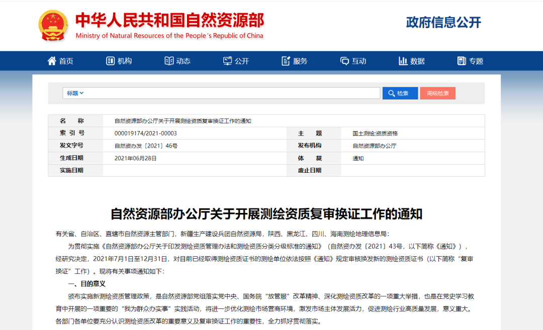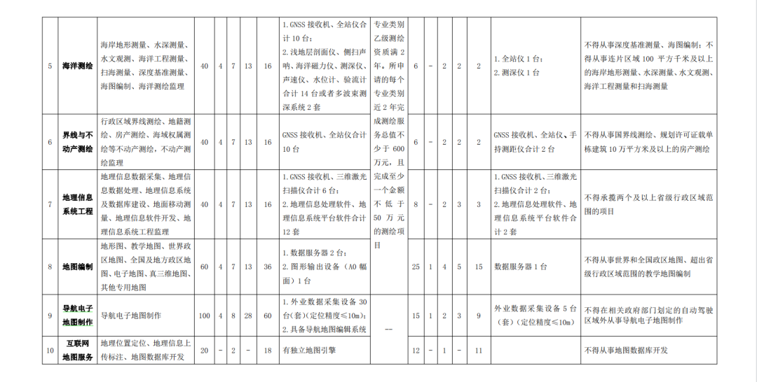 还需注意的是:导航电子地图制作甲级资质审批和管理由自然资源部负责,其余9个专业类别的甲级测绘资质审批和管理权限下放至升级自然资源主管部门。 4 Q& C! |8 W' _# i) G