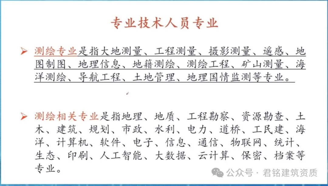 7 [) `, z6 V2 h4 \7 ~  在申请测绘资质过程中,企业的人员占据了非常重要的地位。可以这么说,只要人员没问题,其他都不是问题。接下来给大家介绍一下测绘各专业的人员标准。, M& L- J0 R/ h+ _& c/ v4 h9 I