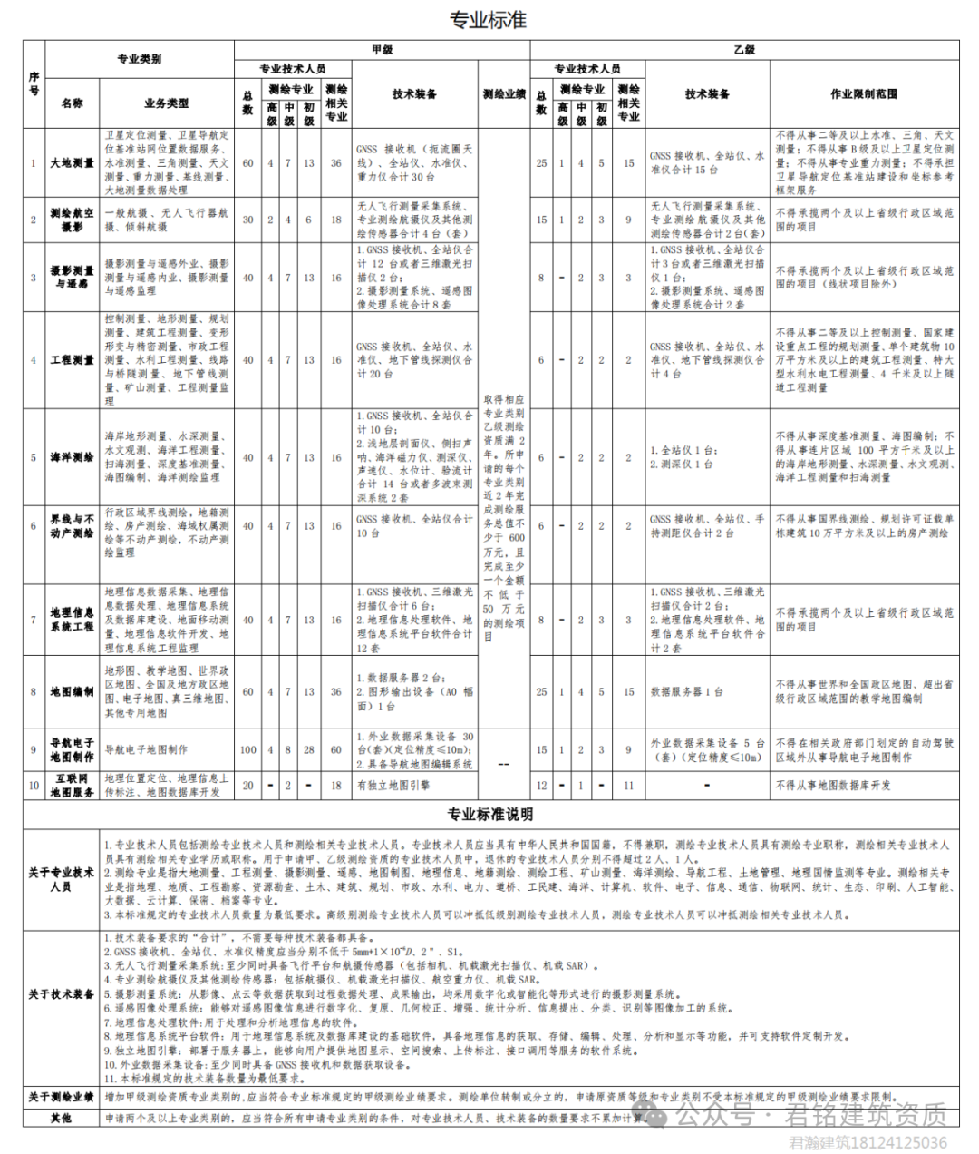 新测绘资质标准分为10个专业:1.大地测量 2.测绘航空摄影 3.摄影测量与遥感 4.工程测量 5.海洋测绘 6.界线与不动产测绘 7.地理信息系统工程 8.地图编制 9.导航电子地图制作 10.互联网地图服务,其中导航电子地图制作和互联网地图服务这两个专业是可以直接办甲级。只要人员配备满足条件下,一个公司可以一次申报多个专业,人员共用,但是人员配置需要按最高要求的那个专业来,例如公司想办理工程测量要求6人,2中级2初级2相关专业,地理信息系统工程要求8人,2中级3初级3相关专业,那只需要按照8个人员的标准来准备。下面就分别讲解一下这10个专业人员配置要求。1:大地测量甲级配备人员:高级测绘工程师4名,中级测绘工程师7名,初级测绘工程师13名,测绘相关人员36名,总共需要60名专业技术人员。大地测量乙级配备人员:高级测绘工程师1名,中级测绘工程师4名,初级测绘工程师5名,测绘相关人员15名,涉密人员若干名,总共需要名25专业技术人员。2:测绘航空摄影甲级配备人员:高级测绘工程师2名,中级测绘工程师4名,初级测绘工程师6名,测绘相关人员18名,总共需要30名专业技术人员。测绘航空摄影乙级配备人员:高级测绘工程师1名,中级测绘工程师2名,初级测绘工程师3名,测绘相关人员9名,涉密人员若干名,总共需要15名专业技术人员。3:摄影测量与遥感甲级配备人员:高级测绘工程师4名,中级测绘工程师7名,初级测绘工程师13名,测绘相关人员16名,涉密人员若干名,总共需要40名专业技术人员。摄影测量与遥感乙级配备人员:中级测绘工程师2名,初级测绘工程师3名,测绘相关人员3名,涉密人员若干名,总共需要8名专业技术人员。4:工程测量甲级配备人员:高级测绘工程师4名,中级测绘工程师7名,初级测绘工程师13名,测绘相关人员16名,总共需要40名专业技术人员。工程测量乙级配备人员:中级测绘工程师2名,初级测绘工程师2名,测绘相关人员2名,总共需要6名专业技术人员。5:海洋测绘甲级配备人员:高级测绘工程师4名,中级测绘工程师7名,初级测绘工程师13名,测绘相关人员16名,总共需要40名专业技术人员。海洋测绘乙级配备人员:中级测绘工程师2名,初级测绘工程师2名,测绘相关人员2名,总共需要6名专业技术人员。6:界限与不动产测绘甲级配备人员:高级测绘工程师4名,中级测绘工程师7名,初级测绘工程师13名,测绘相关人员16名,总共需要40名专业技术人员。界限与不动产测绘乙级配备人员:中级测绘工程师2名,初级测绘工程师2名,测绘相关人员2名,总共需要6名专业技术人员。7:地理信息系统工程甲级配备人员:高级测绘工程师4名,中级测绘工程师7名,初级测绘工程师13名,测绘相关人员16名,总共需要40名专业技术人员。地理信息系统工程乙级配备人员:中级测绘工程师2名,初级测绘工程师3名,测绘相关人员3名,总共需要8名专业技术人员。8:地图编制甲级配备人员:高级测绘工程师4名,中级测绘工程师7名,初级测绘工程师13名,测绘相关人员36名,总共需要60名专业技术人员。地图编制乙级配备人员:高级测绘工程师1名,中级测绘工程师4名,初级测绘工程师5名,测绘相关人员15名,总共需要25名专业技术人员。9:导航电子地图制作甲级配备人员:高级测绘工程师4名,中级测绘工程师8名,初级测绘工程师28名,测绘相关人员60名,总共需要100名专业技术人员。导航电子地图制作乙级配备人员:高级测绘工程师1名,中级测绘工程师2名,初级测绘工程师3名,测绘相关人员9名,总共需要15名专业技术人员。10:互联网地图甲级配备人员:中级测绘工程师2名,测绘相关人员18名,总共需要20名专业技术人员。互联网地图乙级配备人员:中级测绘工程师1名,测绘相关人员11名,总共需要12名专业技术人员。