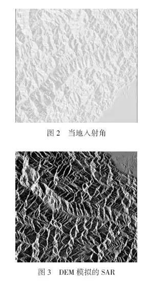 SAR图像模拟 在对SAR图像进行辐射校正前需先进行几何校正,模型参数迭代优化过程需要利用控制点。对于山区,人工寻找控制点需要消耗大量的人力物力,有时很难实现。采用模拟影像与真实SAR影像可以实现快速、自动的高精度配准。目前模拟SAR图像主要分3类:相干系统模拟、非相干的图像模拟和基于图像的模拟。在此采用DEM建立地面坐标系与斜距坐标系的映射关系,进行SAR模拟。首先根据PALSAR成像参数,