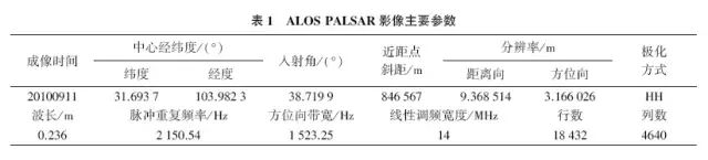 PALSAR数据(见表1),地理坐标为:103°35′47″E-104°22′40″E,31°23′48″N-32°00′13N,位于四川安县与茂县的接合部位;区内地形复杂多样,主要为平坝、丘陵(台地)、中低山3种类型。即以大光包斜冲断层和北川冲断层为界,西北部属四川西部地槽区的前龙门山褶断带,系龙门山脉,地势较高,高川乡境内的大光包海拔30474 t3 N9 s4 s; w# }& C; ^