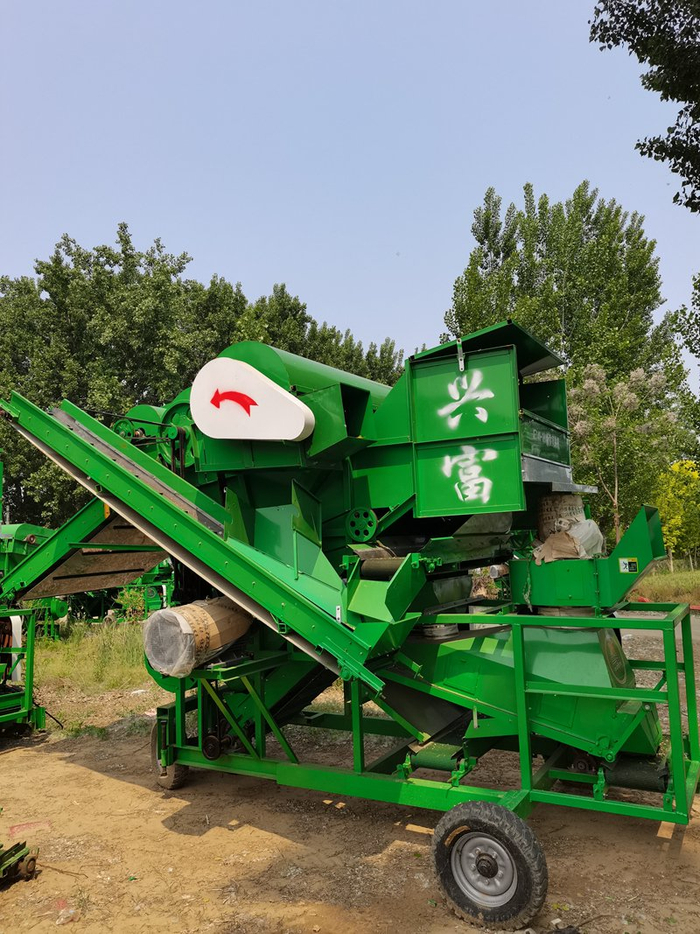 + x5 F2 X# O0 s6 ~0 g$ M% o 特点:滚筒式花生摘果机主要由滚筒、凹板筛、风机等部件组成。其工作原理是通过高速旋转的滚筒对花生植株进行打击和揉搓,使花生果与植株分离。这种类型的摘果机具有结构简单、操作方便、工作效率高的特点。滚筒的转速可以根据不同的花生品种和植株状况进行调整,以达到摘果效果。此外,滚筒式花生摘果机通常配备有风机,可以将摘果过程中产生的杂质和轻小的杂物吹走,提高花生果的清洁度。