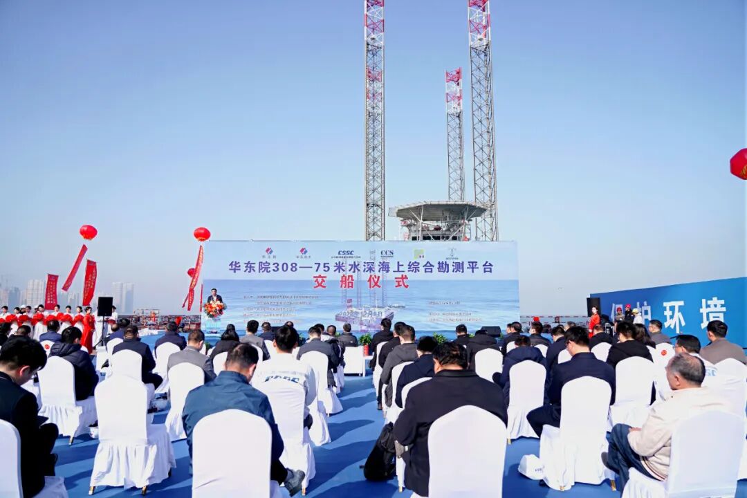 刘加进代表华东院致辞,他指出海洋是国家综合国力竞争的重要领域,华东院在海洋科技创新、装备革新上持续投入,并依托“华东院308”平台研发,完成多项核心技术攻关任务,形成了系列科研成果,为国内深远海技术装备建设树立了新标杆。“华东院308”平台的投产,将进一步提升我院海洋装备和技术水平,为行业发展更好地贡献华东院智慧和解决方案,为建设海洋强国作出新贡献。 ( m) k3 C. q. t) c9 M0 x! ^
