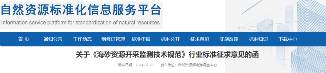 $ m4 s3 `& c9 t3 m8 f! I$ G% _9 \ 《海砂资源开采监测技术规范》行业标准(计划项目编号:202221013)现已完成标准征求意见稿。根据《自然资源标准化管理办法》的有关规定,现予以公开征求意见。如有意见,请在平台在线填写反馈意见,或将意见以电子邮件形式反馈至联系人。