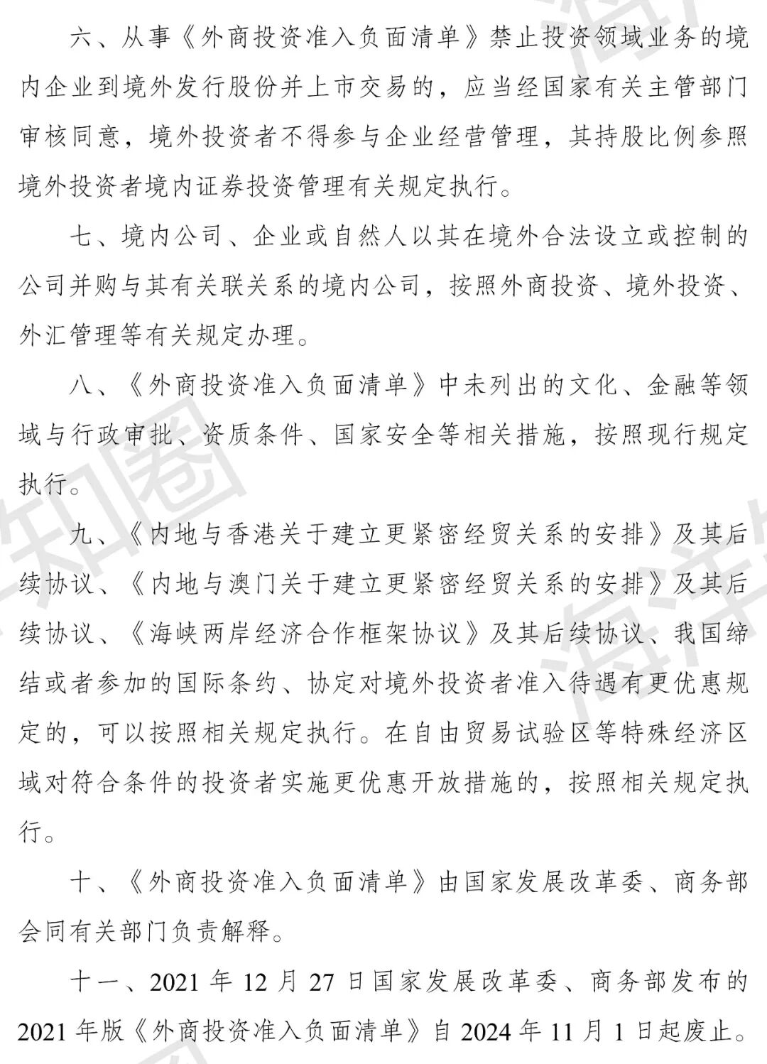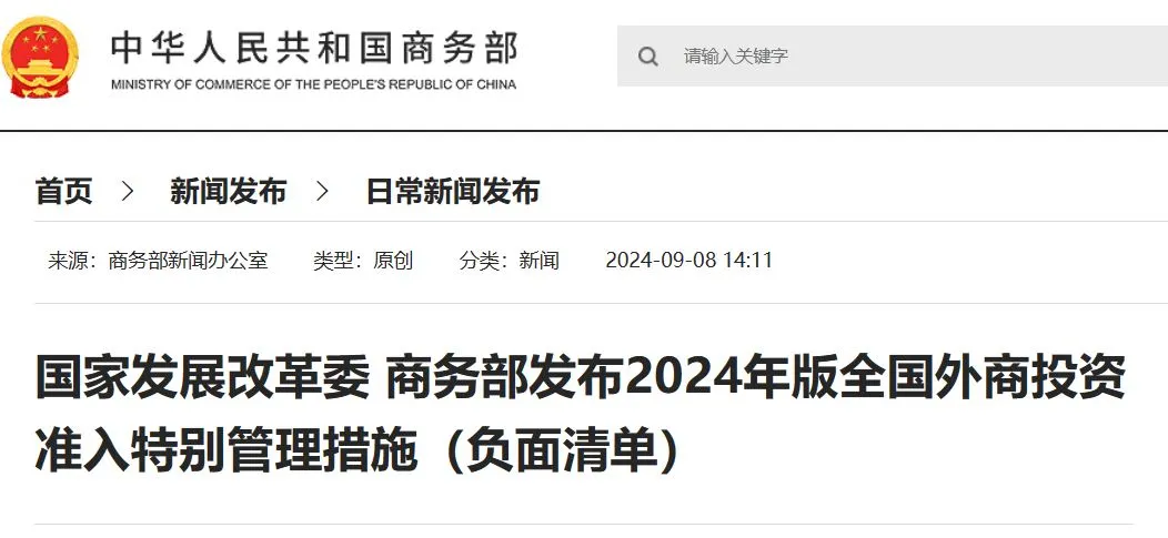 经党中央、国务院同意,国家发展改革委、商务部于2024年9月8日发布第23号令,全文发布《外商投资准入特别管理措施(负面清单)(2024年版)》,自2024年11月1日起施行。《外商投资准入特别管理措施(负面清单)(2021年版)》同时废止。