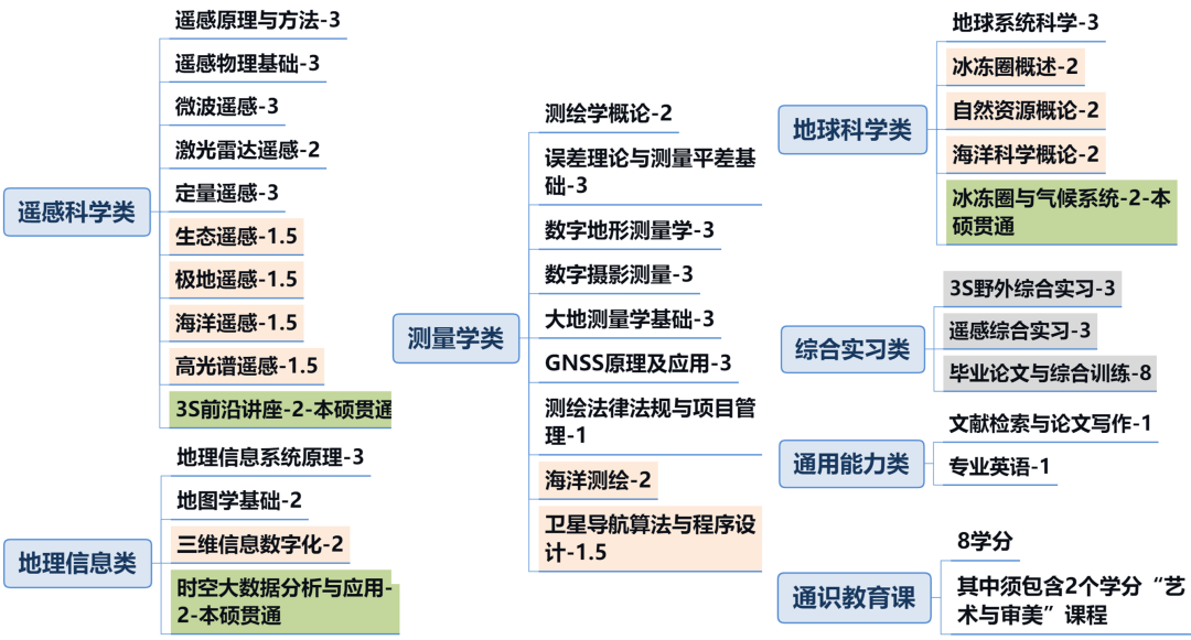 2 o+ J5 R7 d/ `( w4 z1 e 本科阶段主要学习课程包括公共基础类、数学物理类、计算机类、遥感科学类、地理信息类、测量学类、地球科学类、综合实习类、通用能力类和通识教育类等课程。构建了“强化基础→融合实验→全面育才”的人才培养体系,形成了“遥感数据获取源头软硬件”+“野外测量与测图” +“室内数据分析、综合应用” +“信息服务”的一体化培养方案,完善了课程教学知识体系。在课程体系中设置了较大比重的实验课程,强调学生对本专业核心技术的掌握,注重培养富有实际操作能力与创造能力的复合型优秀人才。