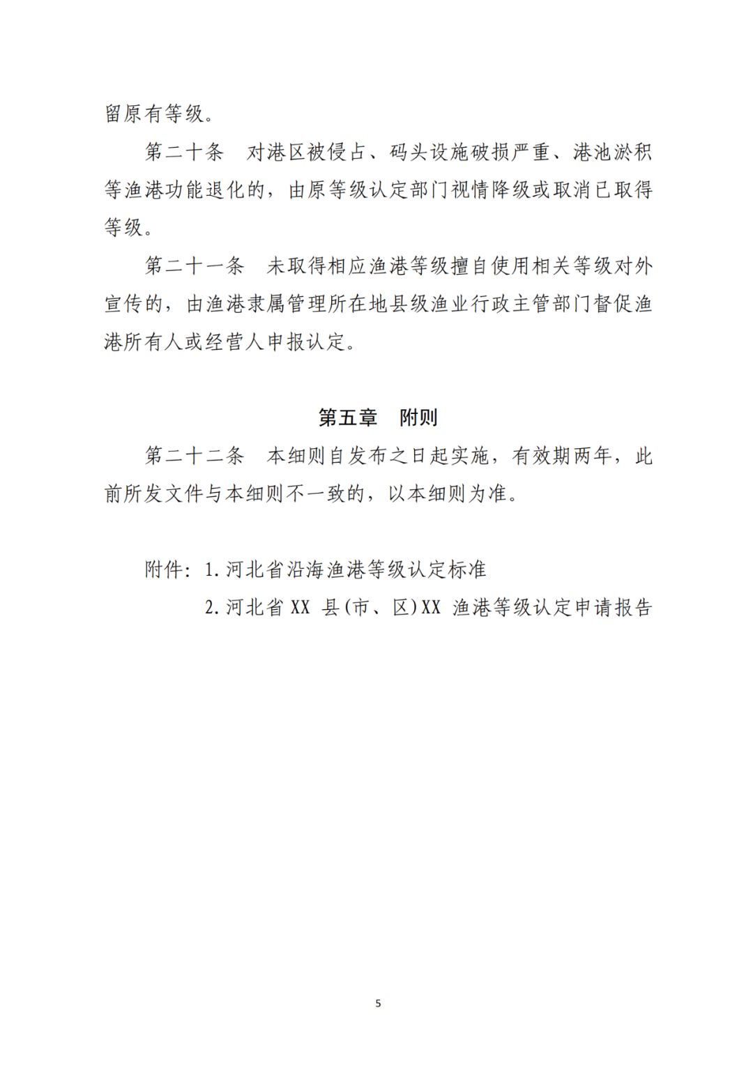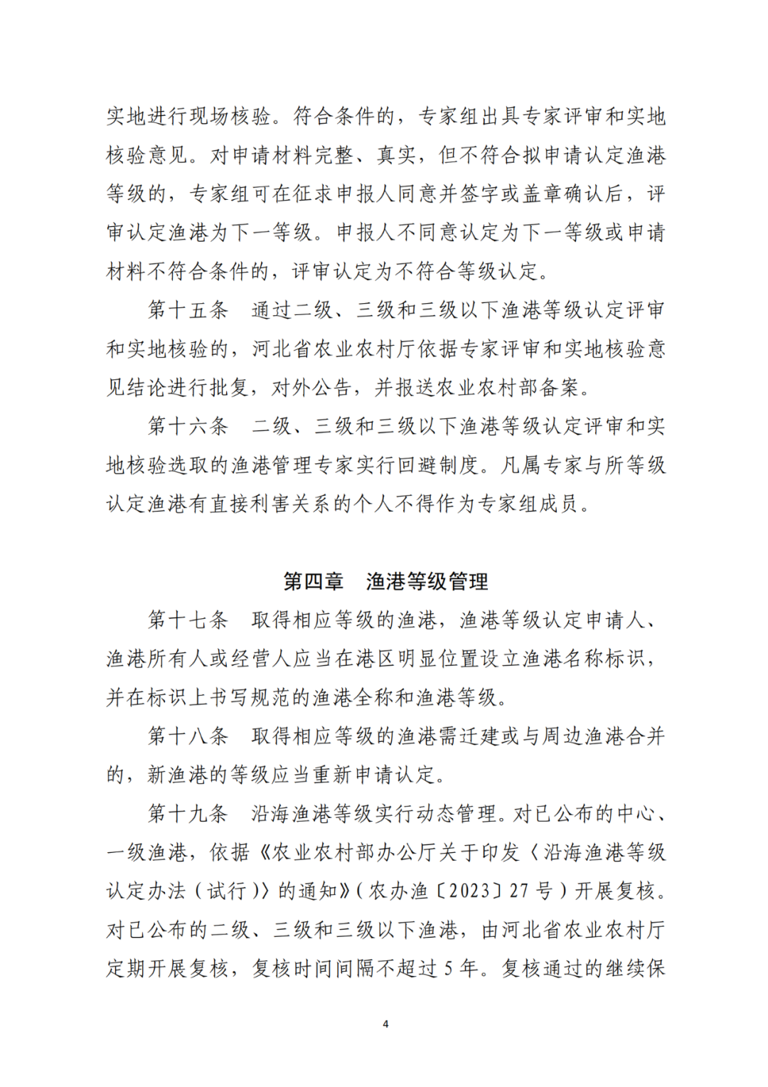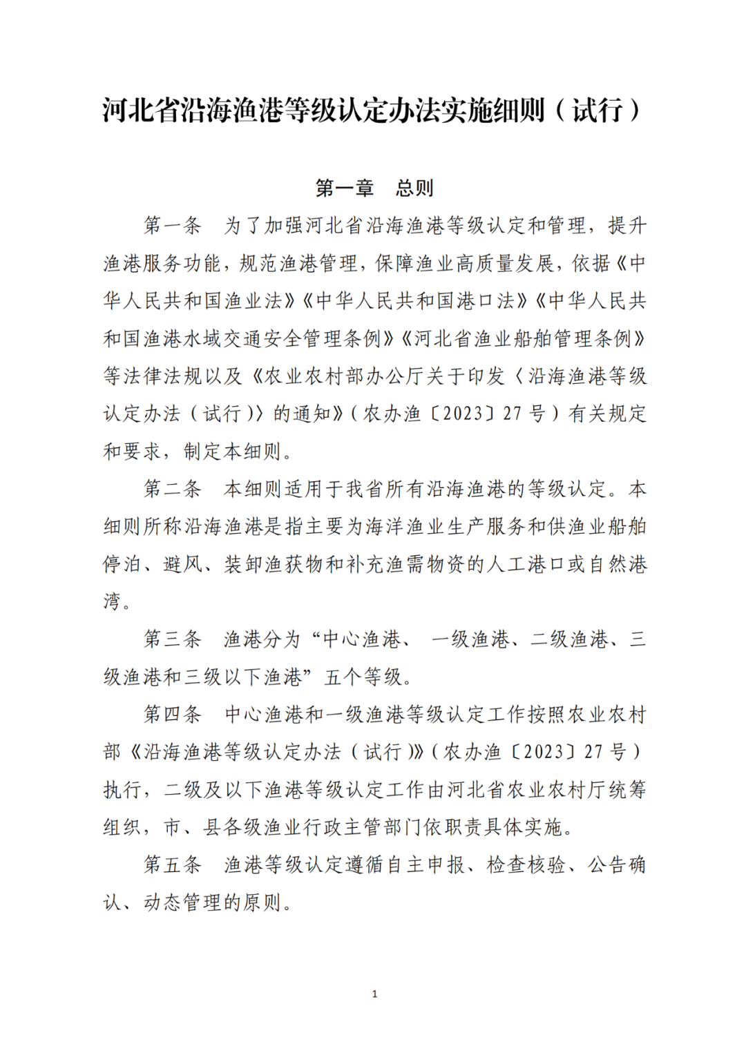 各有关单位及专家: 根据《农业农村部办公厅关于印发〈沿海渔港等级认定办法(试行)〉的通知》(农办渔〔2023〕27号)有关要求,为做好河北省渔港等级认定工作,我厅拟定了《河北省沿海渔港等级认定办法实施细则(试行)(征求意见稿)》。为保证细则的适用性和可操作性,现公开征求意见,相关附件可在河北省农业农村厅网站(http://nync.hebei.gov.cn/)信息公开专栏查询和下载。如有修改意见,请于5月20日前将意见和建议发送至河北省农业农村厅渔政处。联系方式:河北省农业农村厅渔政处 0311-86256563电子邮箱:hbsyzygc@126.com附件:1.河北省沿海渔港等级认定办法实施细则(试行)(征求意见稿).pdf2.农业农村部办公厅关于印发《沿海渔港等级认定办法(试行)》的通知.pdf5 y% \) ]) `3 p