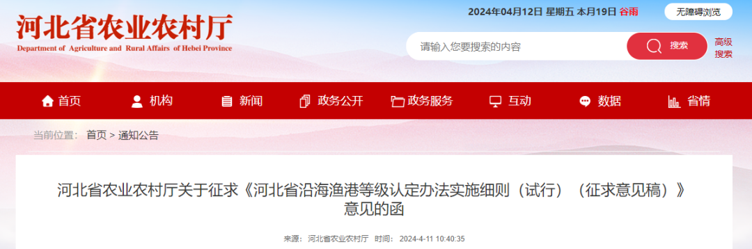 7 o! t4 z/ P8 x' q. w 河北省农业农村厅关于征求《河北省沿海渔港等级认定办法实施细则(试行)(征求意见稿)》意见的函) F! l4 y- y6 K2 D& [) W