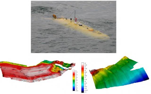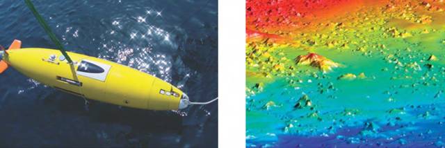 美国Hydroid公司生产的REMUS-100,REMUS-600和REMUS-6000等REMUS系列智能水下机器人性能卓越,已经被多国采购。科学家们利用REMUS智能水下机器人完成了大量的海洋环境观测和数据采集试验。REMUS智能水下机器人及其探测的海底特征如图7所示。