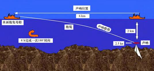 水面船拖曳的深拖系统,在水深不足800m时,通过拖船上的声学设备对拖鱼进行定位;在超过800m的水域,通常布置长基线阵列对拖鱼进行定位。长基线虽然精度高,但是成本高、耗时长,涉及在海底布放声学位置应答器信标环网(基阵),在初始阶段为确保其可用性,需要冗长的校准过程。因此,为了提高探测精度,采用水面船拖曳的深拖系统往往需要两艘船舶,一艘作为拖船,一艘作为航行在拖鱼上方的定位船舶。深拖系统如图3所示。 # L0 I: g) F: f6 _& h5 c
