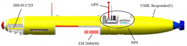 + s! k$ Q* S& W5 ] 图11为哈尔滨工程大学研制开发的300kg级小型AUV。为了实现在海洋资源考察、海底地形地貌探测、海洋数据采集等方面所需要的高精度需求,该AUV除了搭载常规的侧扫声呐系统外,也配备了GeoSwath Plus多波束系统,实现了小型化、智能化、高精度的水下地形探测系统。
