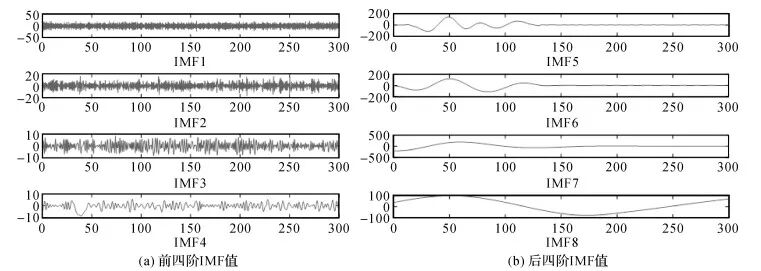 4 B5 W9 R0 A" G( g, h0 ~, |- j1 J 首先将本文得到的仿真数据进行EMD分解,得到八阶IMF值如图 5所示。 图 5 经验模型八阶IMF分解量 Fig. 5 Eighth-order IMF decomposition of EMD