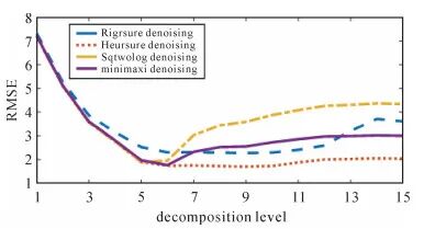 由于小波分解层级是影响去噪效果的主要参数之一,因此,本文通过逐一增加分解层数来找到最佳去噪分解层,其去噪精度好坏利用均方根差(RMSE)进行判断 (13)式中,N为信号采样数;f(ti)为去噪信号;yi为原始无噪声信号。图 4统计了4种小波阈值去噪算法一至十五阶分解层级的RMSE值,从中可以看出4种小波软阈值去噪法在前六阶分解中精度迅速提高,启发式阈值去噪六阶以后精度趋于平稳,且精度最高;其他去噪算法精度都有不同程度的下降。综上可知,小波软阈值去噪法中,启发式阈值对回波信号去噪最为理想,将分解层数设为六阶去噪效果最优。 图 4 小波阈值去噪分解层级精度比较 Fig. 4 Comparison of accuracy of wavelet threshold denoising decomposition level
