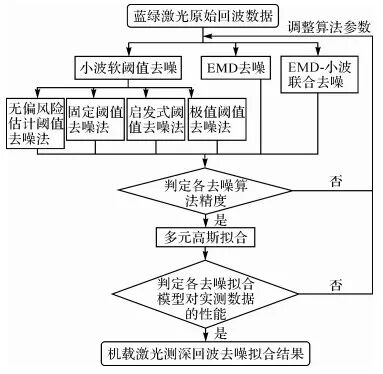 波形去噪是机载激光测深数据处理的关键步骤,本文对小波软阈值去噪法、EMD去噪法,与联合去噪法进行对比试验,反复调节各试验参数以达到最佳去噪效果。再利用实测数据进行去噪拟合,从而对去噪算法的实际效果做出评判。流程如图 2所示。 图 2 本文算法流程 Fig. 2 Flow diagram of new algorithm 图选项2.1 小波阈值去噪