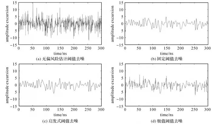 采用4种软阈值小波去噪方式对前文得到的仿真数据进行去噪。 1 A* D; e9 Q) k% u5 A