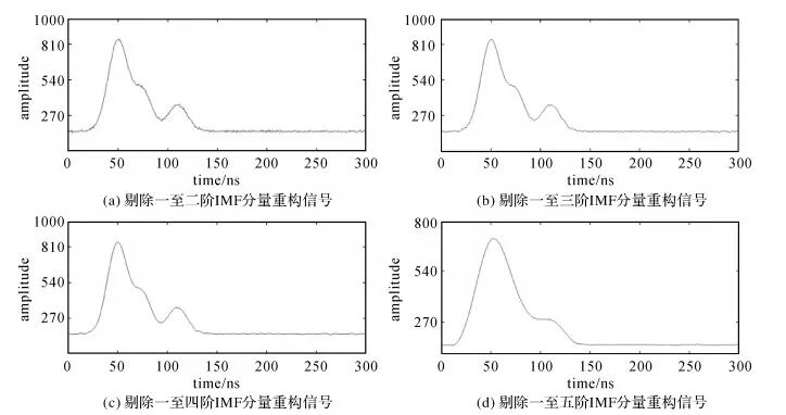 ( ]9 S k) E* n- \9 i) [7 t 从图 6可以看出:将一阶和二阶IMF剔除后信号中仍然存在较大噪声,逐一剔除一至四阶IMF分量后,原始回波信号噪声得到了一定抑制,而剔除前五阶IMF后重构回波信号开始出现信号失真,图 6中的图(d)出现了较大偏差。故将一阶IMF作为纯噪声剔除,二至四阶IMF分量可看作噪声与信号的过渡层根据数据采集量的大小作适当筛选,五阶之后的IMF分量作为有效信号回波予以保留。 图 6 逐一剔除IMF分量后的重构信号 Fig. 6 Reconstructed signals after removing IMF components one by one 7 V1 N. h2 G! l" a3 P* y& _