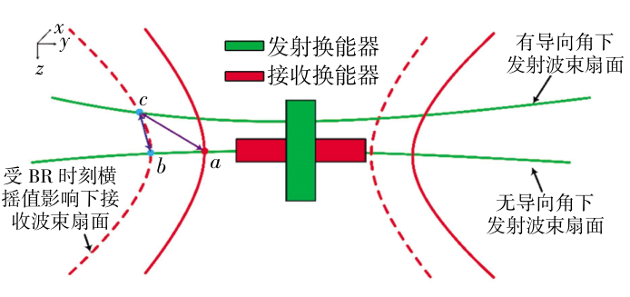 若将发射和接收换能器看作整体,其换能器声学中心可假定位于发射换能器与接收换能器米尔斯交叉点附近。如图1所示,波束接收(BR)时刻横摇会对接收波束能量产生明显偏转,当波束入射角增大时,波束在海底投影形成的曲线曲率增加,开口变窄,在无其他角度影响时,其角度偏差大小为横摇值,波束脚印实际位置由a点变化为b点;在发射导向角的共同影响下,波束脚印实际位置变化为c点,且该误差随发射导向角和波束入射角的增大而逐渐扩大。