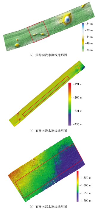 # K; O. \" ~/ C7 d! p r+ W7 l7 v 选取无发射导向作用的浅水数据、带发射导向作用的浅水数据和带发射导向作用的深水数据,三组数据信息如表2所示。三组数据地形图如图5所示。其中,图5(a)、图5(b)、图5(c)分别对应表2中1、2、3三组数据中用于计算结果比对的测线地形图,红框区域为用于精度评定的与检查测线重叠部分。