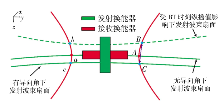 ; [& X! v+ a! }7 K- o' |, ~& e$ w 波束发射(BT)时刻纵摇使得发射换能器绕换能器坐标系Y轴在XOZ面内发生旋转,造成发射波束能量沿航迹线方向发生前后位移,进而产生大小为纵摇值的角度偏移。如图2所示,受波束发射时刻纵摇影响,波束脚印实际位置由a点变化至b点,在发射导向角的共同作用下变化为c点。
