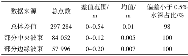 利用两模型对第2组数据进行处理,计算两模型水深差值并提取部分中央波束和边缘波束结果,并对结果进行统计,如表5和图7所示(统计结果为差值的绝对值)。参照《水运工程测量规范》(JTS131—2012)中相关精度要求进行精度评定,结果如表6所示。