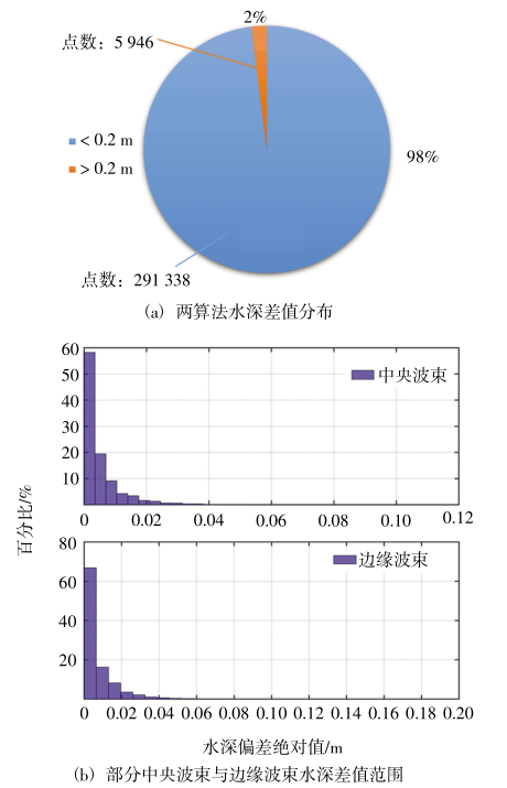 ) i* k) h- z7 E1 L' Y U4 E: K7 R) { 对水深差值进行统计并结合图7可知,对于带导向浅水数据,两算法水深误差在0~18.43m,均值为0.47m,约有89.3%数据误差分布在1.0m内,且存在部分较大误差的数据(约1.4%数据误差大于2.0m);选取的中央波束与边缘波束误差均值分别约为0.38m和0.57m,水深误差在1.0m内的数据占比分别约为94.8%和83.6%。同时由表6可知,收发同体模型深度不符值中误差及均值较VCCA模型大,且存在部分超出2%水深精度的点。对比上节数据可知,第2组数据姿态变化较第1组较小,但在发射导向角的综合作用下,姿态变化所产生的影响凸显。 , [2 l8 R" \4 B3 b3 i1 ^# u1 C