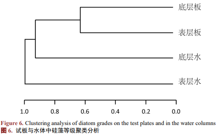 6 u; U& Z1 I w# _5 ]6 |$ R 图6的聚类分析显示,表层和底层试板表面附着硅藻的群落结构最为相近,其次为底层水体中的硅藻,而与表层水体的差异较大。