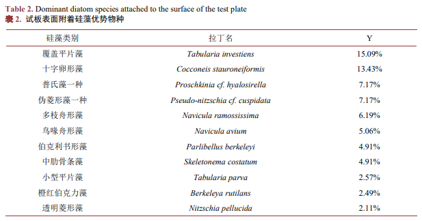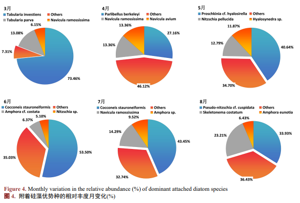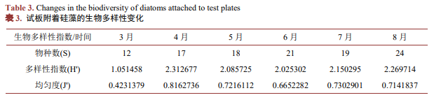 ) l9 Y F. B1 `& U( e, O7 g J 附着硅藻的物种数在3月份最低为12种,随后物种数逐渐升高,至8月份最高为24种。7月份物种数略低,为19种。Shannon多样性指数(H)在3月份时最低(1.05),4月份达到最高值(2.0),随后基本稳定(表3)。 & N8 u2 l8 z! u# M- I- P U$ d