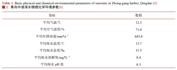 ! H8 Q- R! \: @. `. R. b8 d 于2016年3~8月在青岛中港海鸥浮码头投放月板试样架进行挂片实验(环境理化因子见表1)。将两个实验架试板分别固定在有金属重锤的尼龙绳上,然后将实验试架试板浸入海水中1 m左右。每月取出并投放新试架试板。用无菌手套将浸入海水的试板取出,放入装有40 mL灭菌海水的离心管中。为研究深度对材料表面附着硅藻的影响,同时降低大型污损生物对附着硅藻的影响,选择青岛冬季无大型污损生物繁殖的季节,即2017年12月至2018年3月进行100天的挂片实验。表层实验试架试板浸入海水1 m左右,底层实验试架试板距离海底1 m左右。第100天取出试板备用,并用采水器,采集表层和底层水样各1 L。