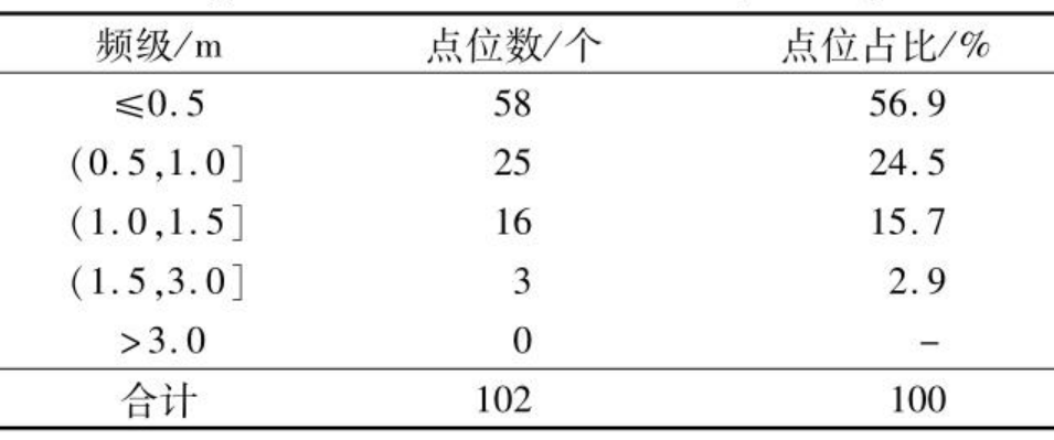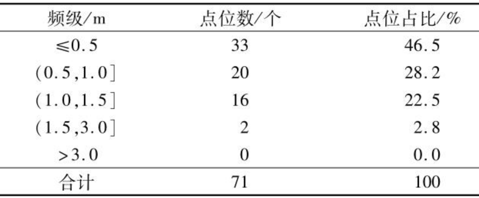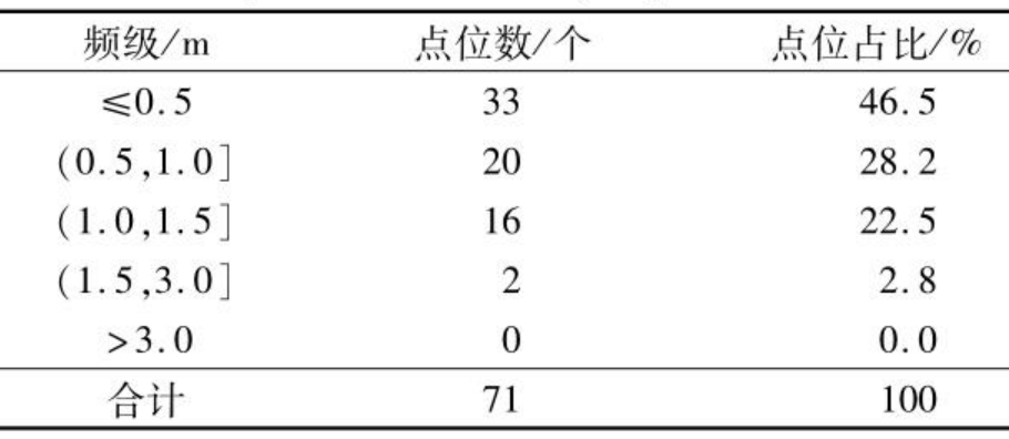 / `7 O) u; v5 ] 该海区由于水深较浅,浅地层剖面探测无法进行,采用磁法探测的手段代替,对直线段部分区域采用往返测的方式获取电缆信息,均能明显探测到两条电缆引起的磁异常。对获取重叠点位的电缆位置信息进行差值统计如表3所示。往返测平面位置互差在1.5m以内的占比达到97.1%。