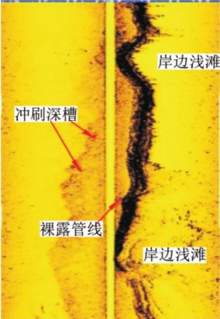 侧扫声呐扫测利用专业后处理软件对侧扫声呐资料进行数据回放,对资料进行解释和分析,管线典型声像见图3,在回放记录上识别海底异常反射现象,掌握海底面状况特征。重点关注海底裸露基岩、沉船、冲刷和其他障碍物等可能对管线安全造成影响的地貌特征,并注意区分船舶尾流和渔网等干扰信号和噪声的影响。利用SonarWiz软件标注海底目标物的位置、形状、大小和分布范围,并对典型记录进行截图。将解释结果导入到AutoCAD软件中,绘制路由区海底面状况图。 0 l* c- o/ F% m! e# F- p4 l