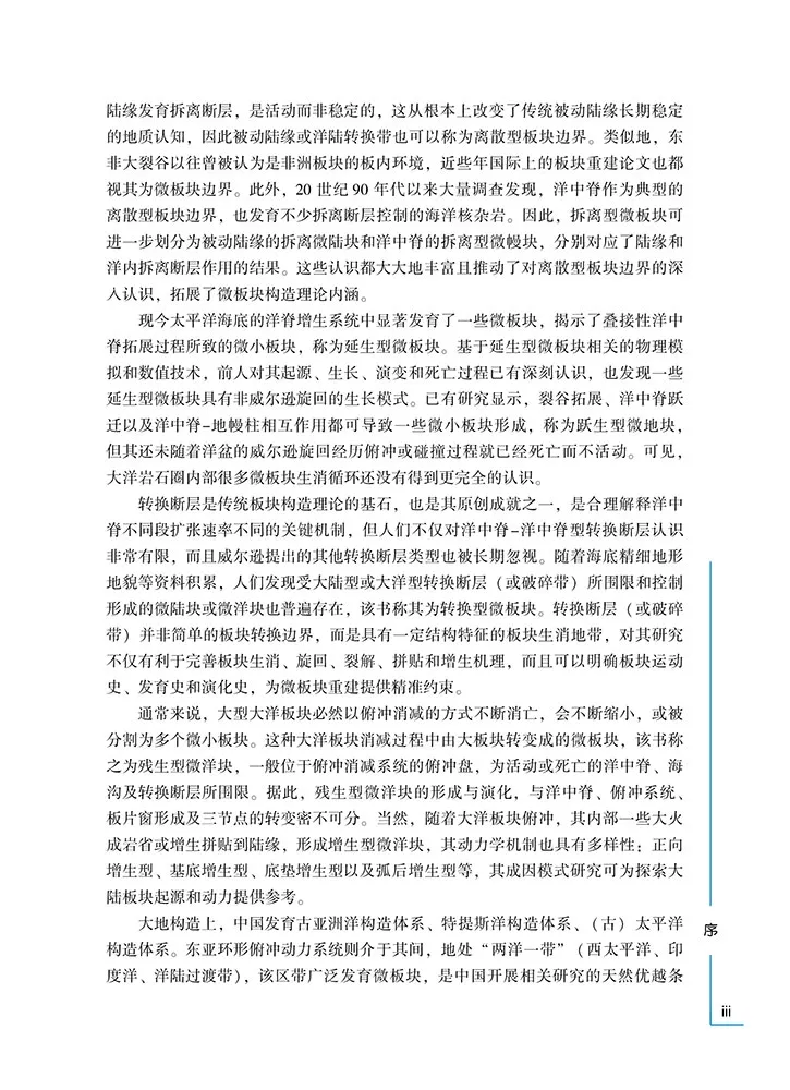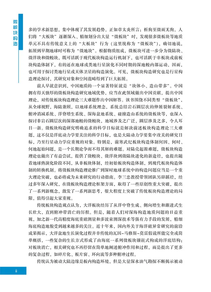 # u u% O+ {$ Y6 G0 D3 K 总之,我很高兴看到地学新理念下组织的《微板块构造》出版。微板块构造研究是区域构造解析与大地构造或板块构造研究的桥梁和纽带,不仅可以增强在全球视野分析区域构造的能力,而且可以密切构造解析与全球板块重建的联系,从而弥补过往研究工作的不足和脱节现象。这对于发展板块构造、重新审视大洋、推动精细深入的全球构造研究、探索“一带一路” 的资源环境灾害效应等前沿科学问题都很有意义,重要且必要。该书提出了很多新概念、新观点、新认识、新思路,会有诸多启发和思考与争议,故推荐与读者分享讨论。 张国伟 中国科学院院士 2023 年9 月10 日摘编自《微板块构造》(李三忠著.北京: 科学出版社, 2024.10)一书“引言”“后记”“序”,有删减修改,标题为编者所加。; ? A* T, W$ N! U