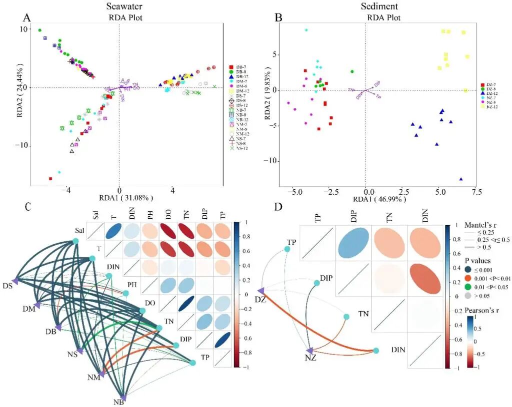 在上述生态型鱼礁结构优化的基础上,针对中国黄海北部沿岸海洋牧场夏季海水极度低氧现象而导致的人工鱼礁区刺参大规模死亡灾害现象,开展了生态型人工鱼礁建设,对低氧现象起到了一定的缓解作用。同时,探究了该区域微生物群落结构及其影响因素,为理解微生物群落对海洋牧场季节性低氧的响应机制提供基础数据,对海洋牧场的管理和保护具有重要意义。上述研究成果以“Response mechanism of microbial community to seasonal hypoxia in marine ranching”为题,发表在Science of the Total Environment。硕士研究生王璐为第一作者,姜昭阳教授为通讯作者。  , @9 }/ q ~* ^9 `: j
