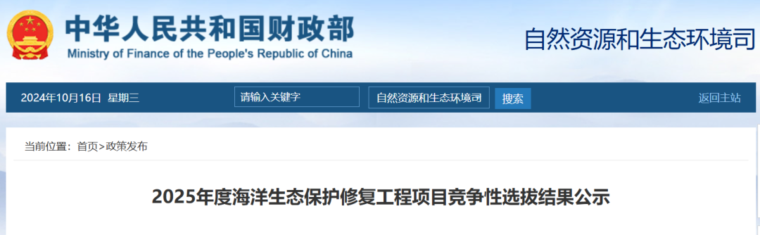 , l' L; v1 ]4 E, ]! T; t 按照《财政部办公厅 自然资源部办公厅关于组织申报2025年度海洋生态保护修复工程项目的通知》(财办资环〔2024〕19号)规定的程序,财政部、自然资源部对地方申报项目组织开展了竞争性评审,根据竞争性评审结果,拟将20个项目确定为2025年度海洋生态保护修复工程项目(详见附件)。